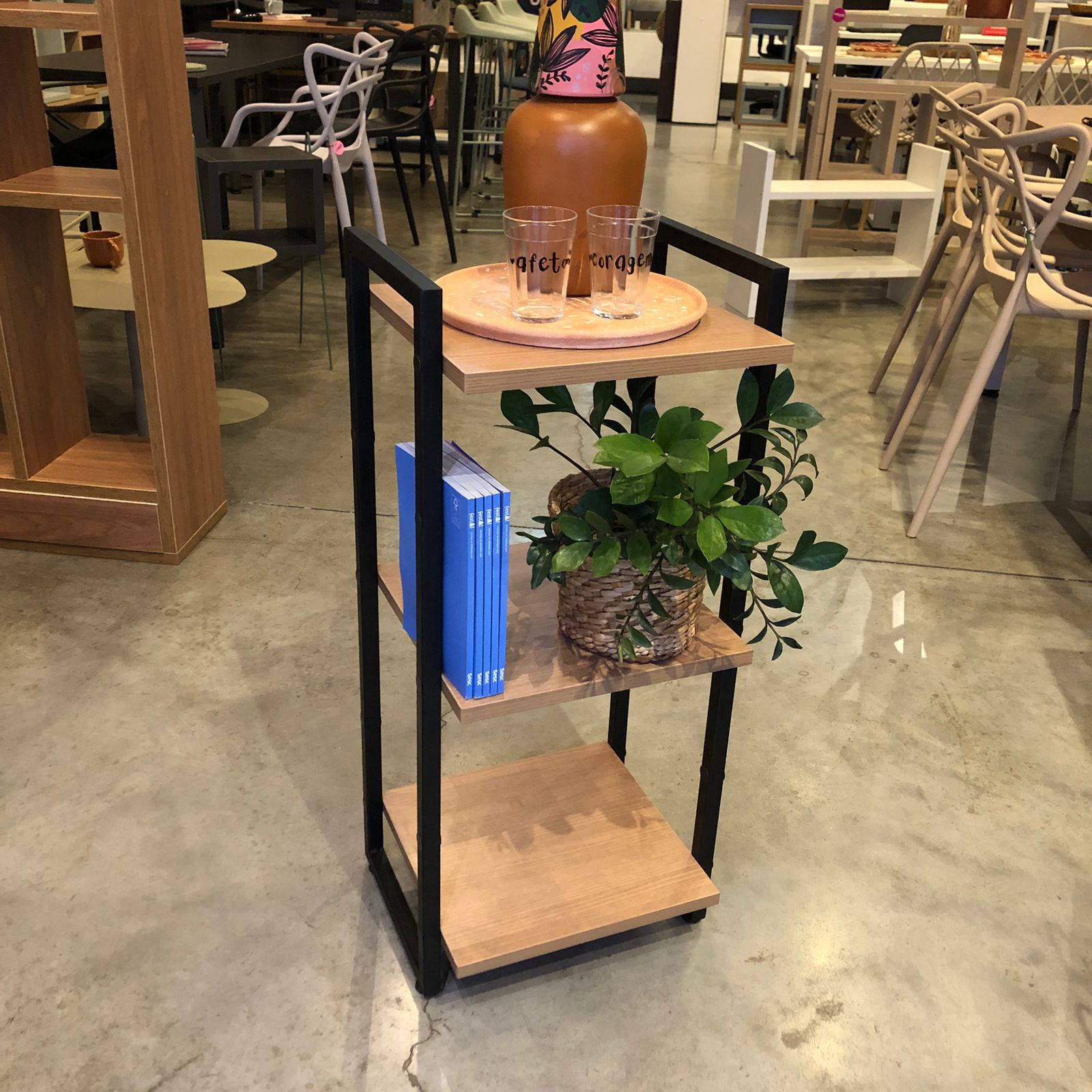 A estante tabela são feitas com aço nas laterais e para esse modelo, utilizamos mini prateleiras pra criar um móvel versátil e funcional!