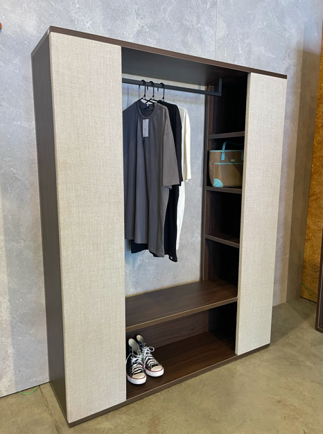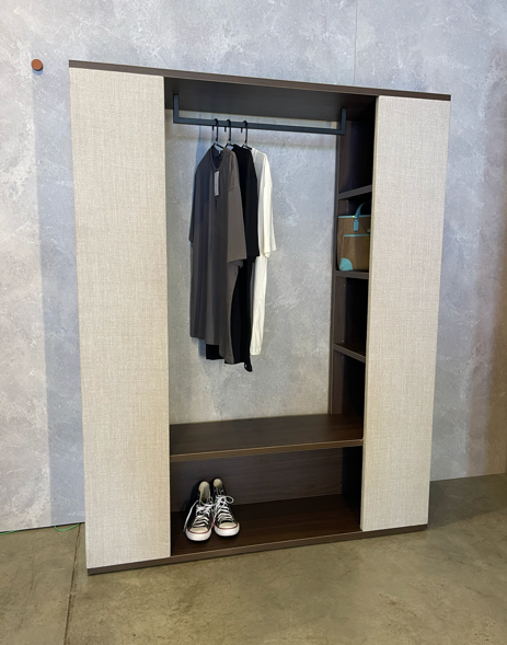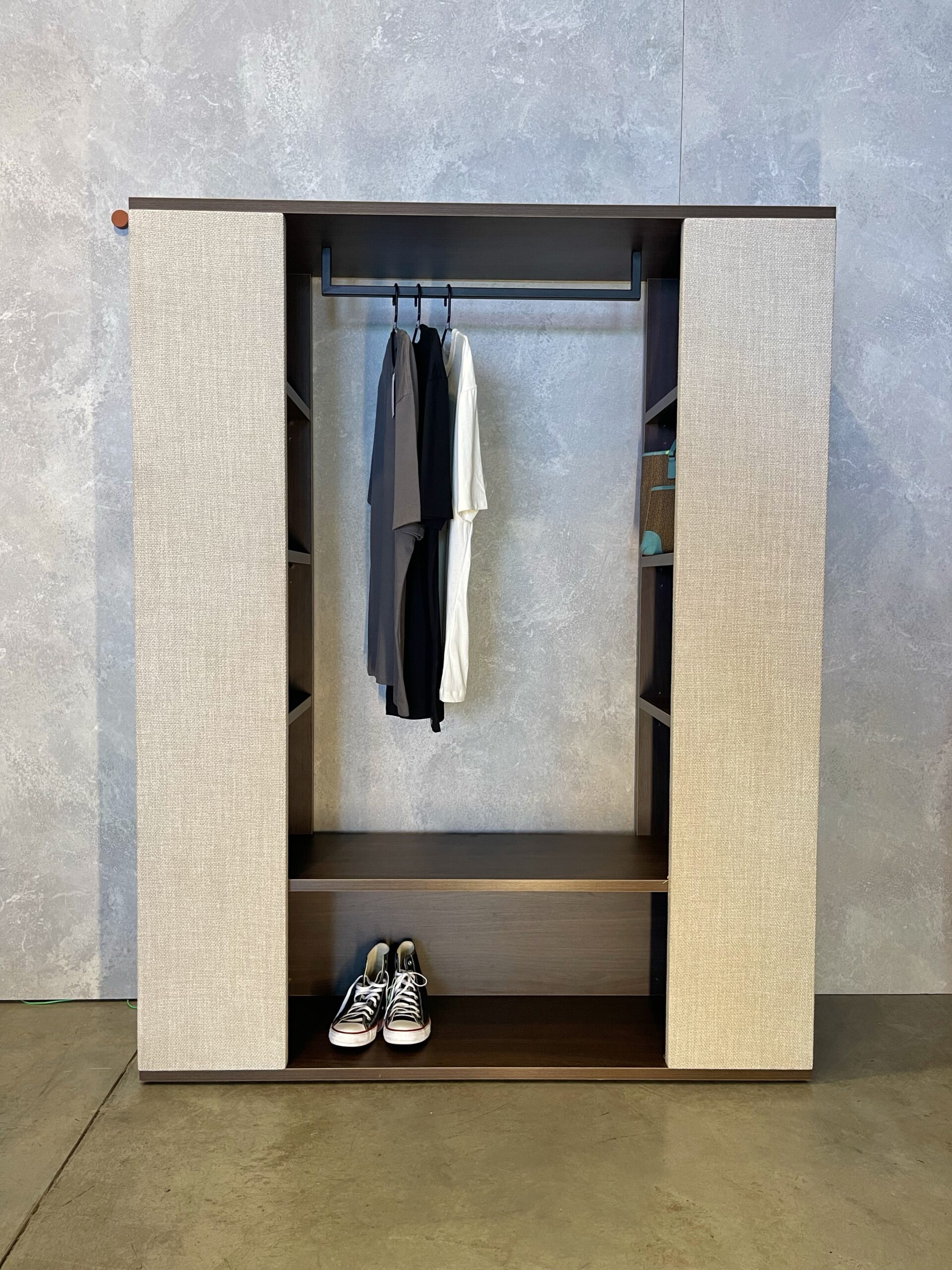 Agora a nossa linha de produtos conta com um Roupeiro! Um móvel muito resistente, todo feito com madeira de 25 mm de espessura, que possui as laterais revestidas em tecido texturizado, que trazem um toque sofisticado e aconchegante ao ambiente. Os nichos laterais abertos servem para organização de roupas e acessórios, além de uma ampla prateleira inferior e cabideiro metálico superior.